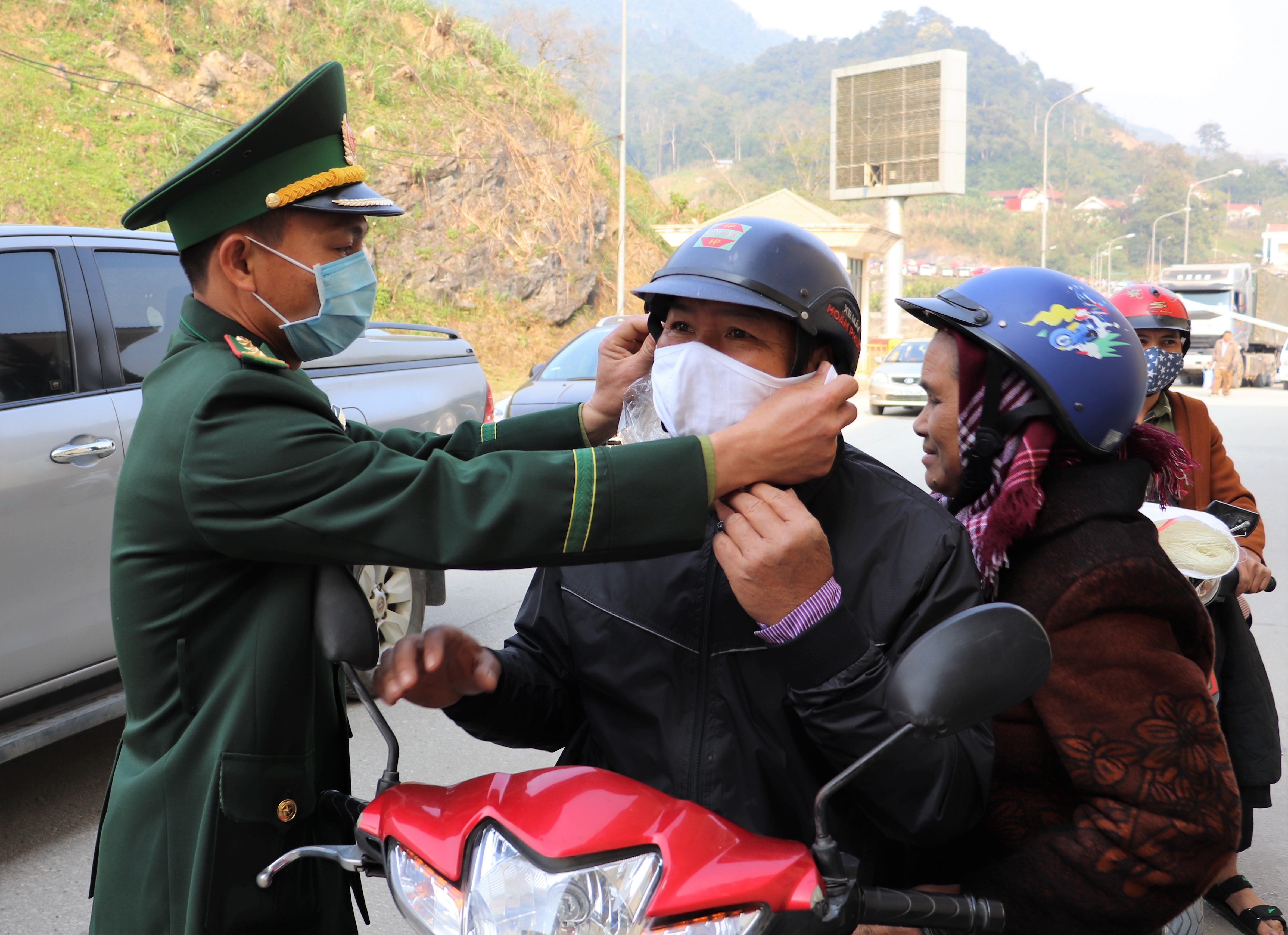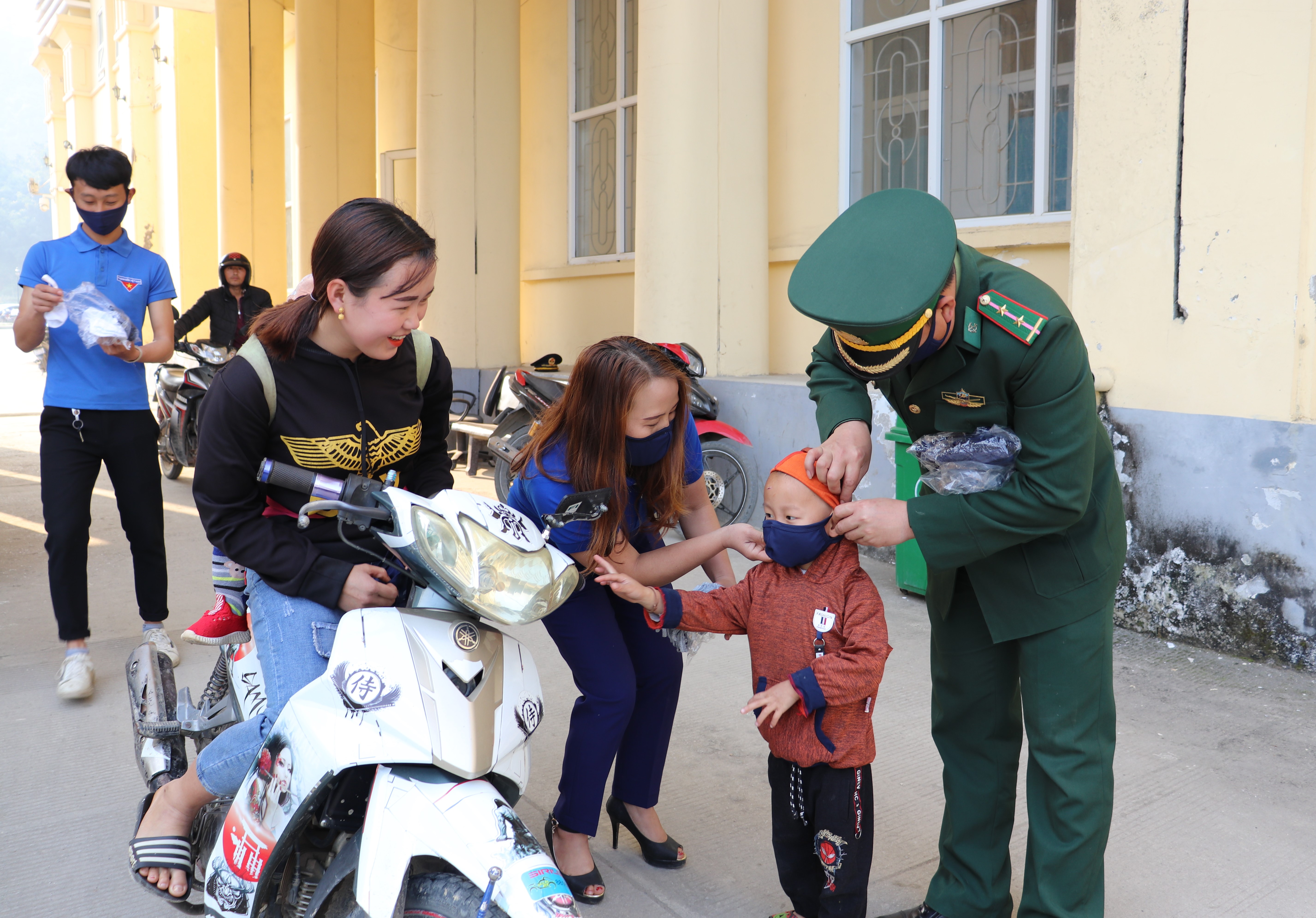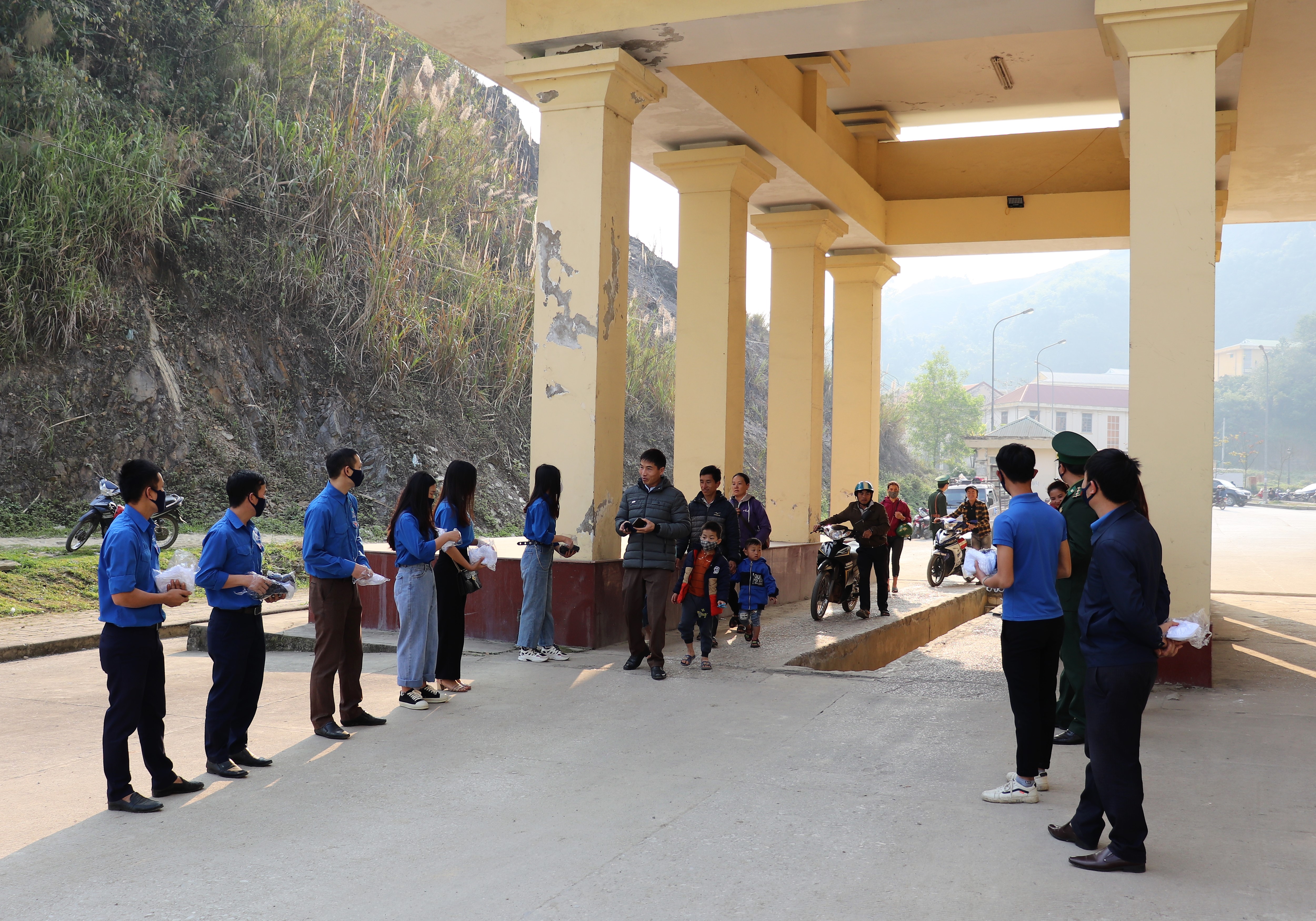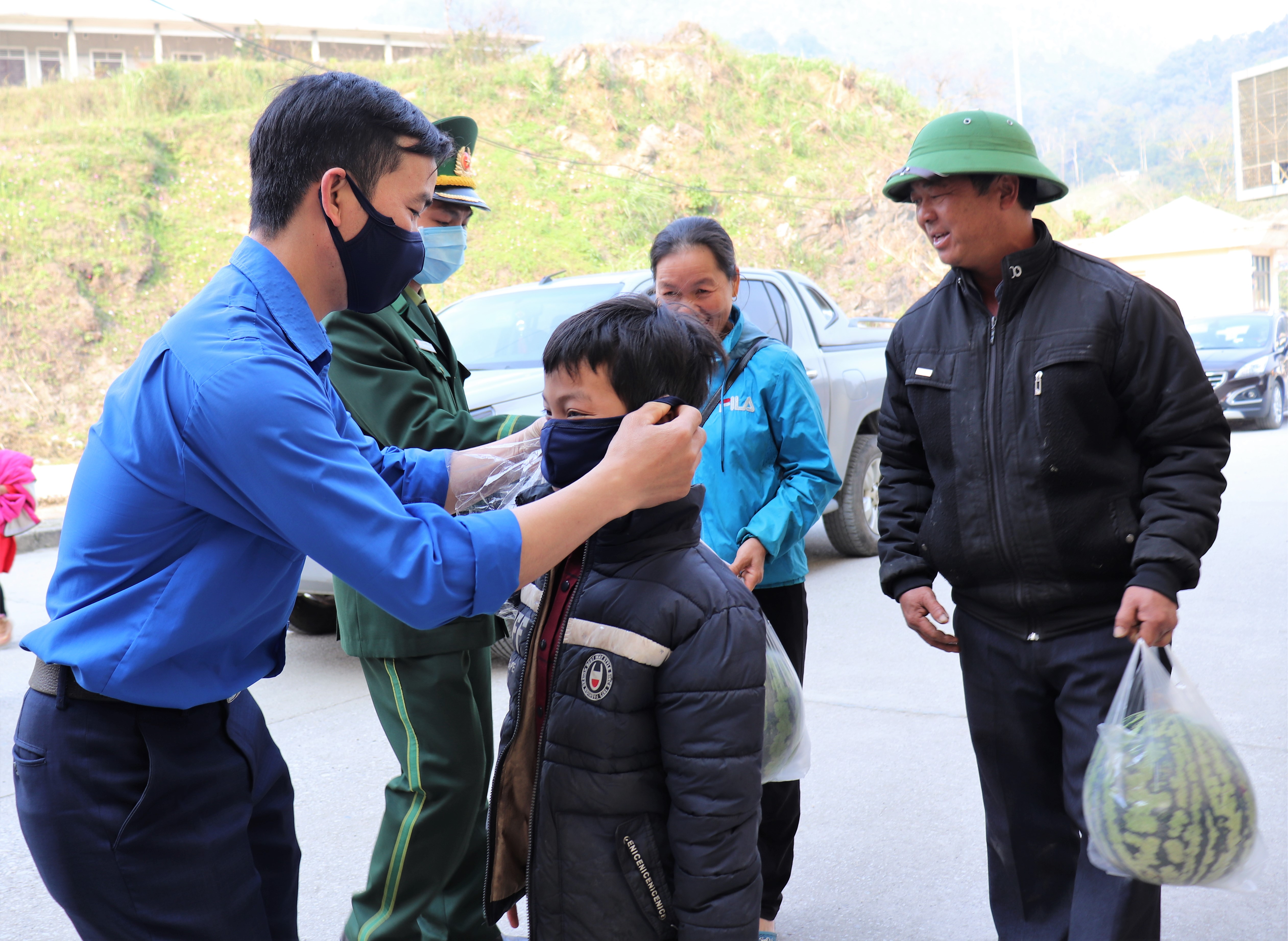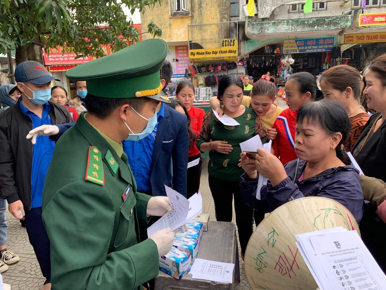 Lực lượng đoàn viên thanh niên phát 1000 khẩu trang miễn phí cho mọi người dân qua lại khu vực biên giới