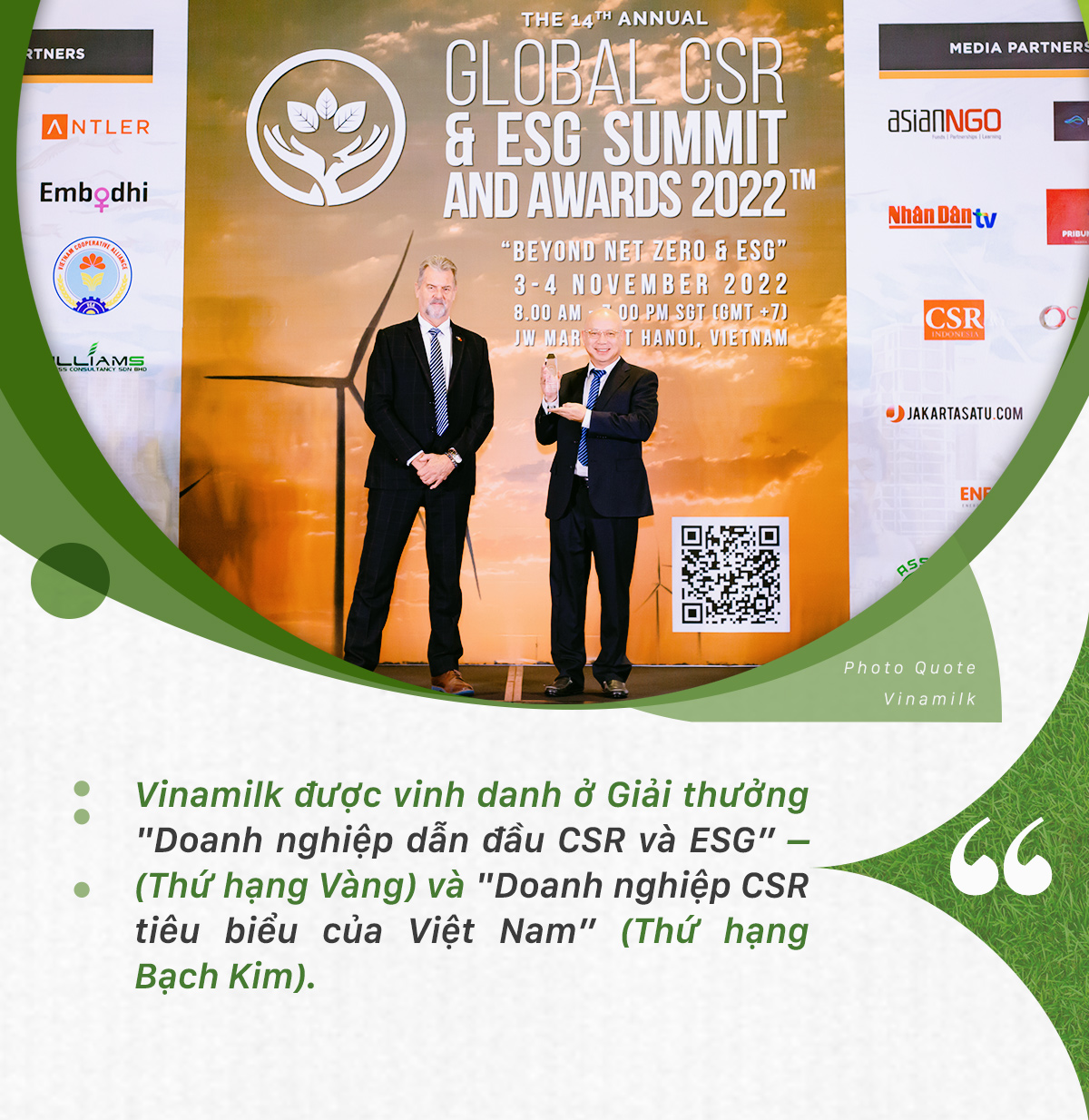 Mới đây, Vinamilk được Ban tổ chức Giải thưởng CSR & ESG toàn cầu vinh danh với 2 hạng mục "Doanh nghiệp dẫn đầu CSR và ESG" – (Thứ hạng Vàng) và "Doanh nghiệp CSR tiêu biểu của Việt Nam" (Thứ hạng Bạch Kim). Điều này cũng cho thấy sự ghi nhận của cộng đồng quốc tế về những nỗ lực và hành động tích cực của Vinamilk trong tiến trình thúc đẩy đầu tư ESG và CSR (Trách nhiệm xã hội của doanh nghiệp).