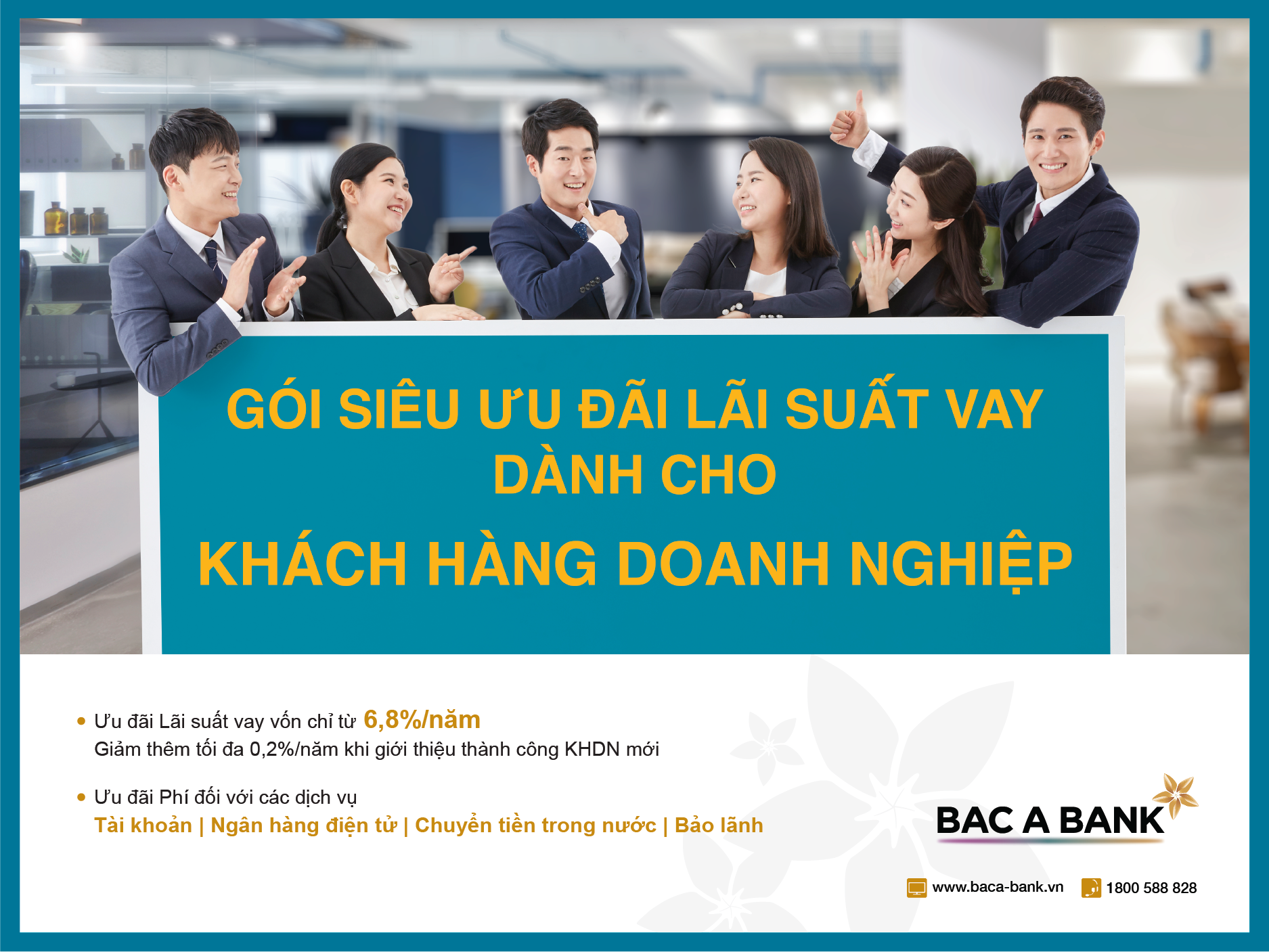 Chia sẻ, đồng hành cùng các doanh nghiệp khắc phục khó khăn cũng như nắm bắt cơ hội bứt phá, Ngân hàng TMCP Bắc Á (BAC A BANK) triển khai Gói siêu ưu đãi Lãi suất vay dành cho Khách hàng doanh nghiệp (KHDN) nhằm giúp các doanh nghiệp chuyển dịch mô hình kinh doanh và tối ưu chi phí để tăng cường sức bền và tính linh hoạt.