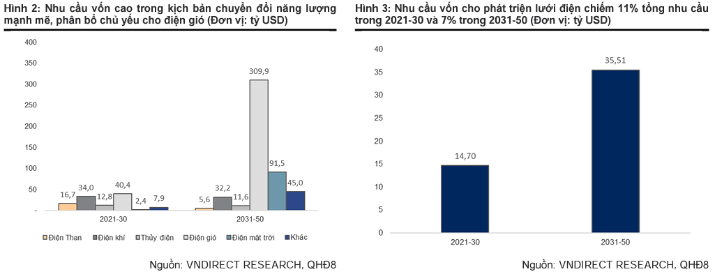 Với kịch bản chuyển đổi năng lượng mạnh mẽ, VnDirect cho rằng áp lực tài chính sẽ lớn hơn nhằm đáp ứng được nhu cầu phát triển công suất nguồn điện của Việt Nam. So với QHĐ7, phương án chính thức trong QHĐ8 sẽ cắt giảm đáng kể việc phụ thuộc vào nhập khẩu nhiên liệu hóa thạch, và giảm thiểu gánh nặng nhập khẩu điện. Tuy nhiên, kế hoạch phát triển công suất trong QHĐ8 dự kiến sẽ làm tăng chi phí đầu tư của hệ thống trong giai đoạn 2021-50 tùy kịch bản.