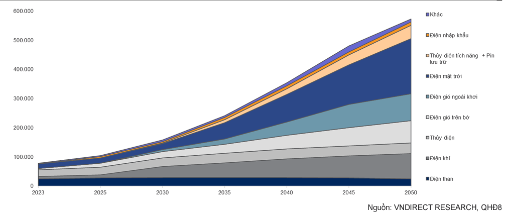 Công suất thủy điện tăng trưởng kép 1% trong 2021-2050 do nguồn điện này về cơ bản đã gần hết tiềm năng khai thác, chỉ còn dư địa để phát triển các dự án thủy điện vừa và nhỏ. Ở khía cạnh khác, QHĐ8 đã mạnh dạn đề cao hơn việc phát triển các nguồn điện lịnh hoạt khác như thủy điện tích năng, pin lưu trữ, và các nguồn điện sinh khối. VnDirect tin rằng sự bổ trợ của các nguồn điện mới này sẽ củng cố sự ổn định của hệ thống điện Việt Nam trong dài hạn.
