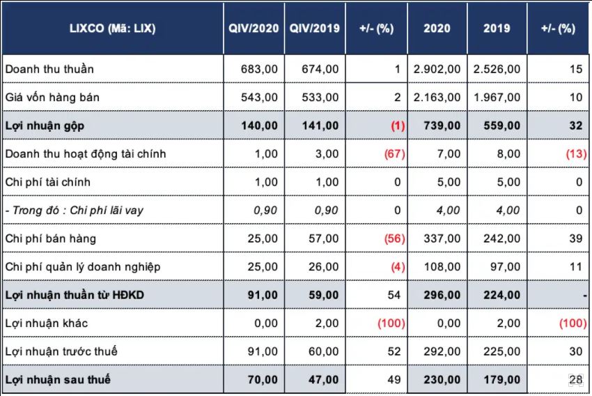 CTCP Bột giặt LIX (Mã: LIX) công bố báo cáo tài chính hợp nhất quý IV/2020 ghi nhận doanh thu thuần đạt 683 tỷ đồng, tương đương với cùng kỳ năm ngoái, trong khi lợi nhuận sau thuế tăng tới 49% đạt 70 tỷ đồng.