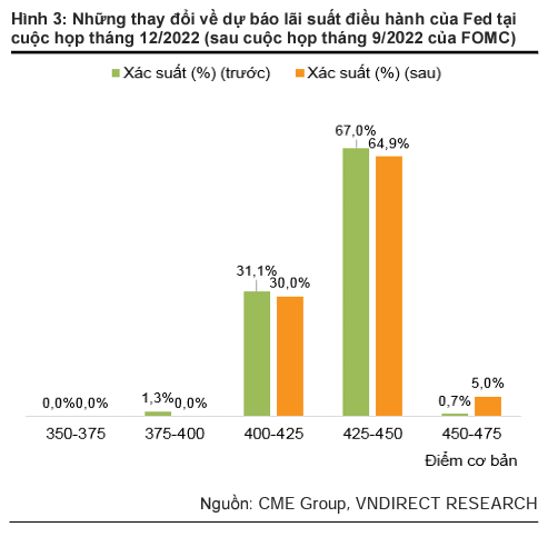 Tuy nhiên, điểm quan trọng nhất trong cuộc họp lần này là những quan điểm cập nhật của Fed về lộ trình thắt chặt chính sách tiền tệ trong thời gian tới. Cụ thể, FED đã đưa ra quan điểm có phần “diều hâu” hơn về việc thắt chặt chính sách tiền tệ, theo đó các quan chức FED dự báo lãi suất điều hành có thể tăng lên mức 4,25-4,5% vào cuối năm 2022 (tương đồng với kỳ vọng của thị trường trước khi cuộc họp diễn ra) và 4,5-4,75% vào cuối năm 2023 (cao hơn khoảng 25 điểm cơ bản so với kỳ vọng của thị trường trước khi cuộc họp diễn ra).