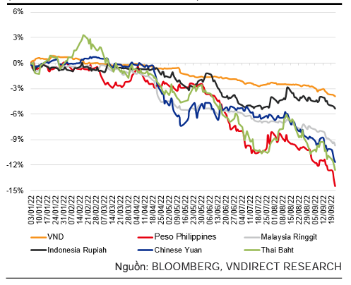 Tuy nhiên, so với các đồng tiền trong khu vực, Việt Nam Đồng vẫn là một trong những đồng tiền ổn định nhất. Kể từ đầu năm 2022 (dữ liệu tính đến ngày 21/09/2022), hầu hết các loại tiền tệ trong khu vực đã giảm hơn 5% so với USD, bao gồm Peso Philippines (-12,6% so với USD), Baht Thái Lan (-11,6% so với USD), Nhân dân tệ của Trung Quốc (-11,6% so với USD), Ringgit Malaysia (9,7% so với USD) và Rupiah Indonesia (-5,4% so với USD).