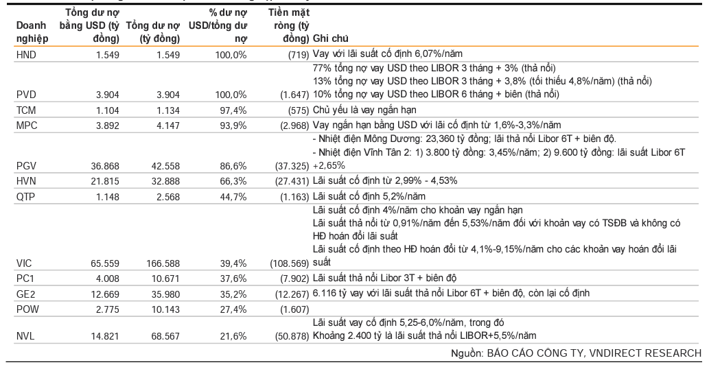 Thêm vào đó, VnDirect cho rằng những DN sử dụng khoản vay USD với lãi suất thả nổi sẽ chịu áp lực lớn hơn những khoản vay có lãi suất cố định. Nguyên do là vì ngoài chịu tác động về tỷ giá lên chi phí lãi và nợ gốc, khoản vay thả nổi sẽ còn chịu thêm áp lực tăng chi phí lãi vay khi lãi suất khoản vay bằng đồng USD tăng lên do FED thắt chặt chính sách tiền tệ.