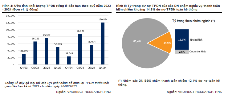 Trong năm 2023, VNDirect ước tính giá trị đáo hạn TPDN vào khoảng 223,4 nghìn tỷ đồng, tăng 45,6% so với cùng kỳ. Trong quý III/2023 sẽ có khoảng hơn 75,9 nghìn tỷ đồng TPDN đáo hạn, tăng 14,9% so với quý II/2023. Nhóm BĐS là nhóm có tỷ trọng lớn nhất chiếm gần 43,6% tổng giá trị trái phiếu đáo hạn trong quý III/2023, đứng thứ 2 là nhóm Tài chính – Ngân hàng với tỷ lệ chiếm 30% tổng giá trị đáo hạn.