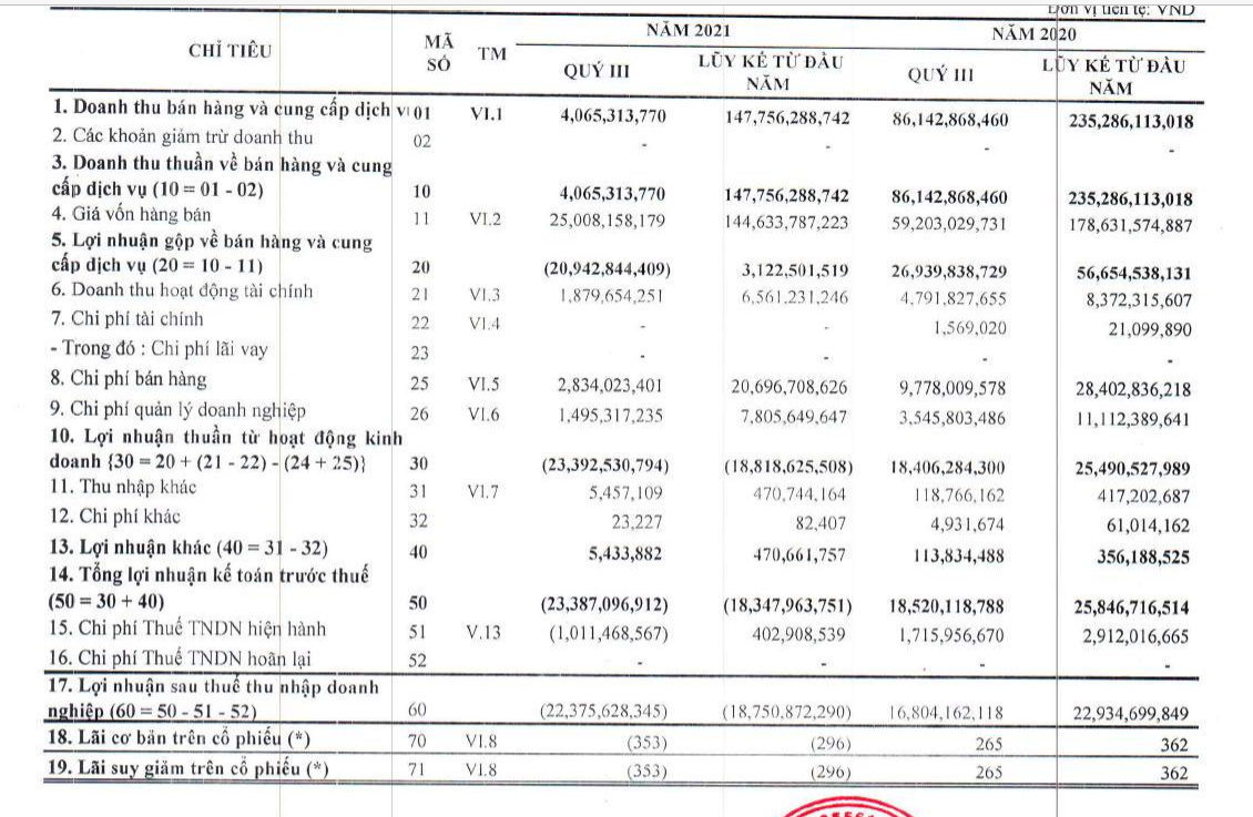 Kinh doanh dưới giá vốn khiến lợi nhuận gộp là âm gần 21 tỷ đồng. Doanh thu tài chính cũng giảm 60% so với cùng kỳ xuống mức 1,8 tỷ đồng. Sau khi trừ các chi phí, SKG báo lỗ 22,3 tỷ đồng trong quý 3, trong khi cùng kỳ năm 2020 vẫn lãi sau thuế 16,8 tỷ đồng.