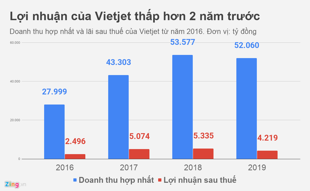 Năm 2019, Vietjet ghi nhận doanh thu bán hàng và cung cấp dịch vụ 52.060 tỷ đồng, thấp hơn 3% so với 2018; lợi nhuận sau thuế 4.219 tỷ đồng, sụt giảm 21%.