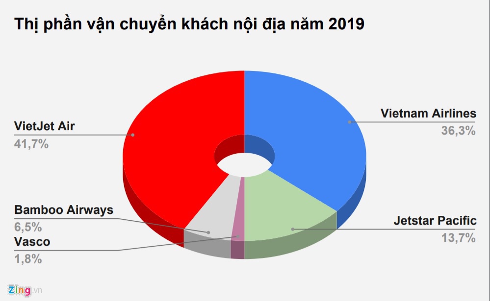 Năm 2019, Vietjet vẫn dẫn đầu về thị phần vận chuyển hàng không nội địa với 41,7% thị phần nhưng giảm 2% so với cùng kỳ năm trước sau khi hãng hàng không Bamboo Airways gia nhập thị trường.