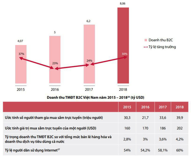 Theo số liệu từ Sách trắng thương mại điện tử Việt Nam 2019, quy mô thị trường thương mại điện tử bán lẻ - B2C (bao gồm cả hàng hóa và dịch vụ) của Việt Nam năm 2018 ước đạt 8,06 tỷ USD, tăng 30% so với năm 2017.