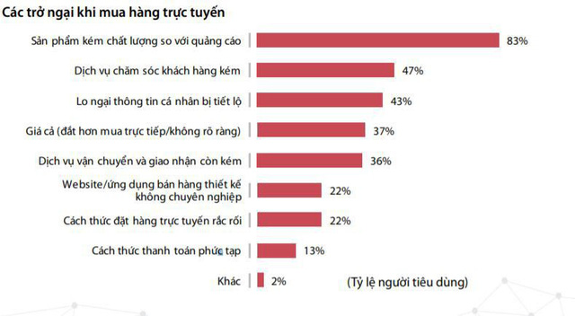 Cũng theo khảo sát, sản phẩm kém chất lượng so với quảng cáo vẫn là trở ngại lớn nhất khi mua sắm trực tuyến, với 83% người tiêu dùng tham gia khảo sát lựa chọn. Tiếp đó là các trở ngại khác như: dịch vụ chăm sóc khách hàng kém (47%); lo ngại thông tin cá nhân bị tiết lộ (43%); giá cả đặt hơn mua trực tiếp hoặc không rõ ràng (37%); dịch vụ vận chuyển và giao nhận còn kém (36%); website, ứng dụng bán hàng thiết kế không chuyên nghiệp (22%)...