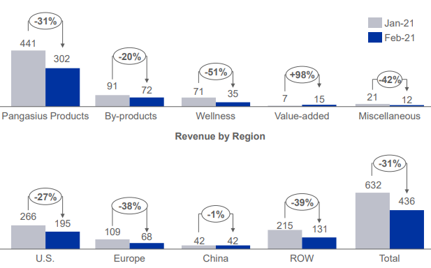 Tổng doanh thu tháng 2/2021 của Vĩnh Hoàn giảm 31% so với tháng 1, chủ yếu do sự suy yếu tại hầu hết mọi thị trường kinh doanh.