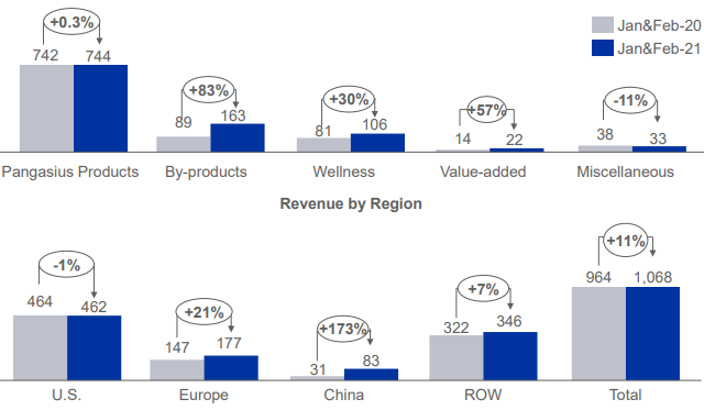 Lũy kế 2 tháng đầu 2021, tổng doanh thu của Vĩnh Hoàn vẫn tăng 11% so với cùng kỳ, chủ yếu nhờ mức tăng trưởng cao của mảng phụ phẩm. Ở thị trường xuất khẩu, doanh thu bán sang Trung Quốc của Vĩnh Hoàn đạt mức tăng đến 173% trong 2 tháng.