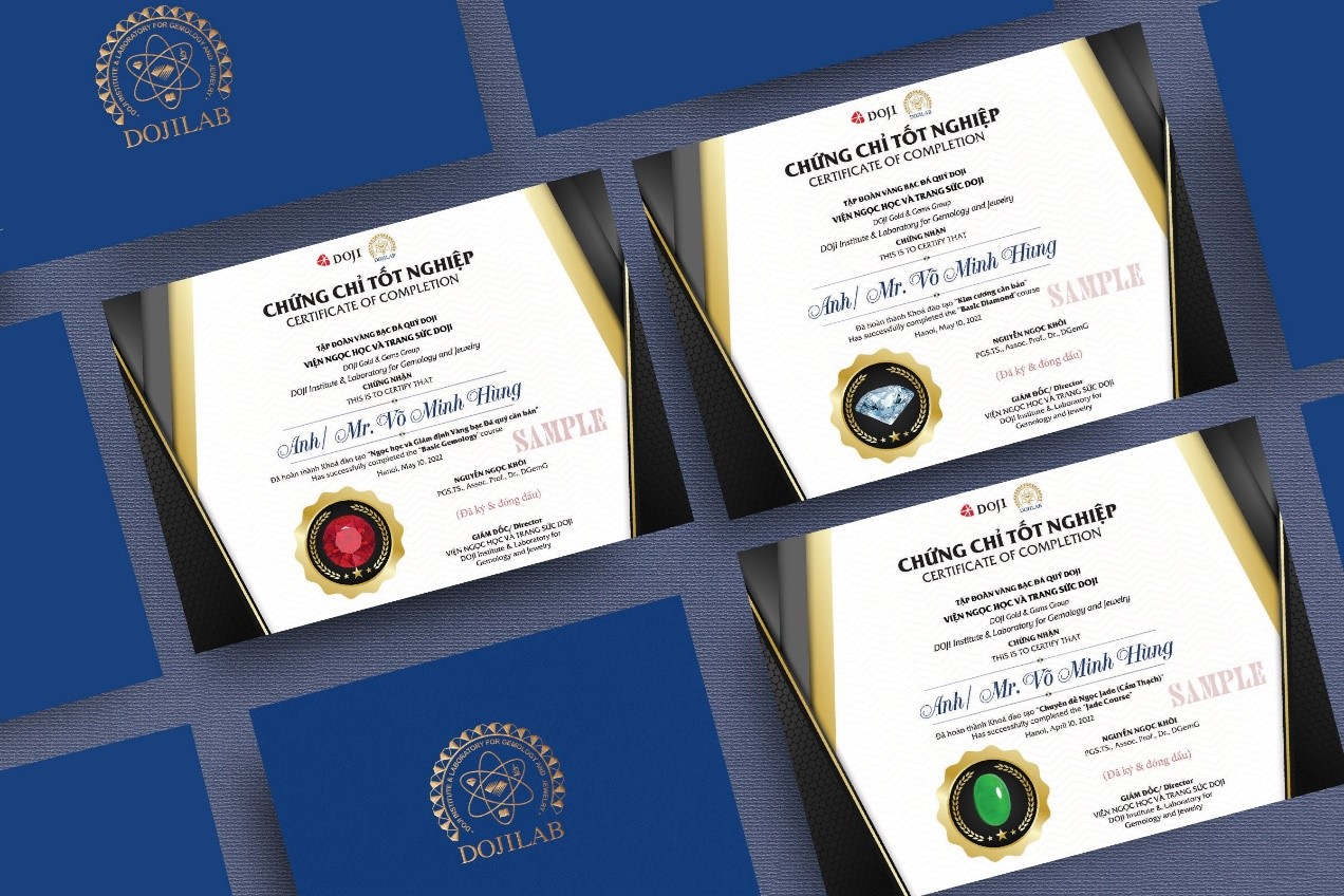 Khi hoàn thành khóa học, học viên sẽ được cấp chứng chỉ Ngọc học của DOJILAB có giá trị sử dụng trên toàn quốc. Chứng chỉ đào tạo từ DOJILAB rất hữu ích đối với những học viên hoạt động trong lĩnh vực Ngọc học và Vàng bạc đá quý. Các bạn học viên có thể là các nhà quản lý, các chủ doanh nghiệp đến các cán bộ kỹ thuật, các thương gia hoặc bất kỳ ai yêu thích. đam mê và muốn tìm hiểu về lĩnh vực đá quý.