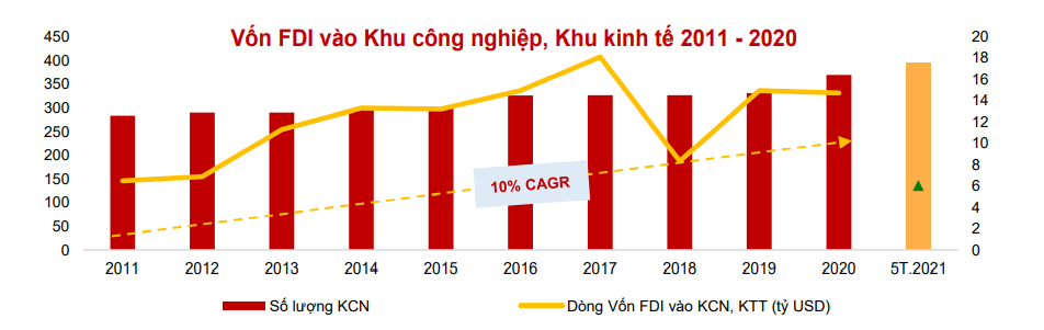 Xét từ phía cầu, Agriseco cho rằng dòng vốn FDI thúc đẩy nhu cầu thuê đất khu công nghiệp. Các khách hàng thuê KCN hiện nay chủ yếu là doanh nghiệp FDI với tỷ lệ 51% trên tổng số dự án đầu tư và chiếm 67% tổng vốn đăng ký mới (theo Bộ KH&ĐT). Do đó, nhu cầu vốn FDI đầu tư vào KCN là rất lớn. Dòng vốn FDI vào KCN tăng 10% CAGR giai đoạn 2011-2020, vốn đăng ký mới vào KCN 5T.2021 đạt 6,02% (tăng 10,3% so với cùng kỳ 2020) với số dự án mở mới đạt 291 dự án.