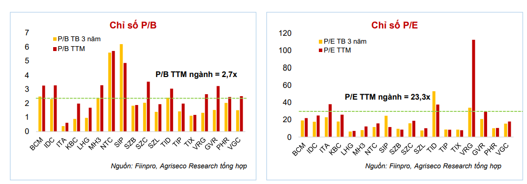 Về mặt bằng giá cổ phiếu, theo Agriseco Research mức định giá các doanh nghiệp: P/B và P/E trung bình ngành hiện tại lần lượt ở mức 2,7x và 23,3x, đều tăng khoảng 30% so với trung bình giai đoạn 2017 – 2020. Nguyên nhân là do từ năm 2019 trở lại đây BĐS KCN sôi động trở lại nhờ chiến tranh thương mại Mỹ - Trung và các Hiệp định Thương mại tự do.
