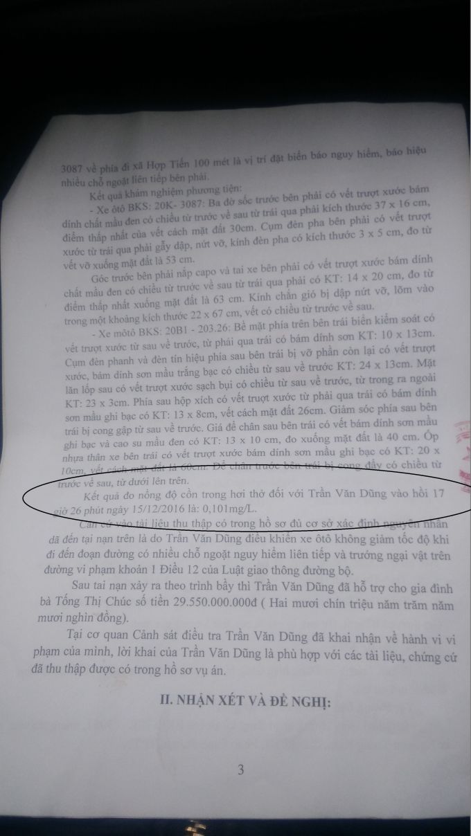 Đặc biệt, trong bản kêt luận của cơ quan điều tra, ngày gây tai nạn là ngày 15/02/2016 nhưng ngày cơ quan này đo nồng độ cồn trong hơi thở ghi can gây tai nạn lại là ngày 15/12/2017, tức là sau 10 tháng gây tai nạn cơ quan điều tra huyện Đồng Hỉ mới “kịp” đô nồng độ cồn. Hơn nữa, thời điểm này nạn nhân đã qua đời gần 49 ngày?