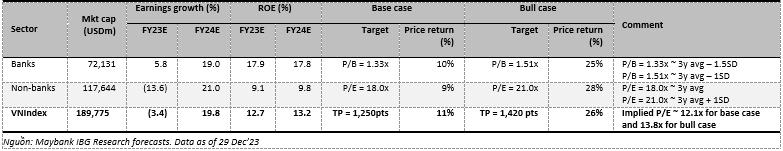 Theo đó, bộ phận nghiên cứu phân tích của MSVN đã xây dựng hai kịch bản cho VN-Index với mức tăng là 1.250 điểm (chủ yếu được thúc đẩy bởi triển vọng lợi nhuận phục hồi) và 1.420 điểm cho kịch bản tích cực (thúc đẩy bởi thanh khoản mạnh hơn từ khả năng nâng hạng thị trường), tương ứng mức tăng lần lượt khoảng 11% và 26% so với mức cuối năm 2023.