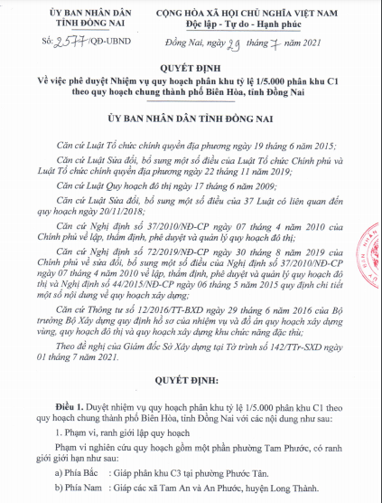 UBND tỉnh Đồng Nai vừa có quyết định số 2577/QĐ-UBND phê duyệt Nhiệm vụ quy hoạch phân khu tỷ lệ 1/5.000 phân khu C1 theo quy hoạch chung thành phố Biên Hòa.