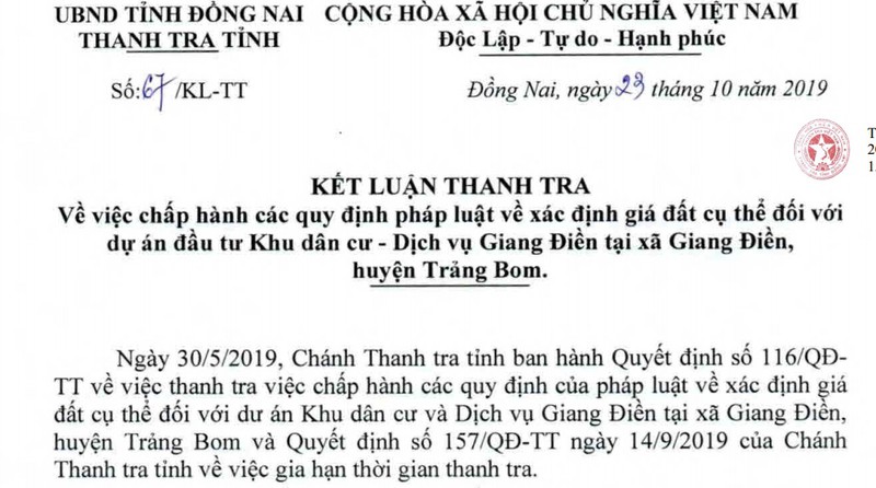 Thanh tra tỉnh Đồng Nai vừa có bản kết luận thanh tra việc chấp hành các quy định pháp luật về xác định giá đất cụ thể đối với dự án KDC Dịch vụ Giang Điền tại xã Giang Điền, huyện Trảng Bom.