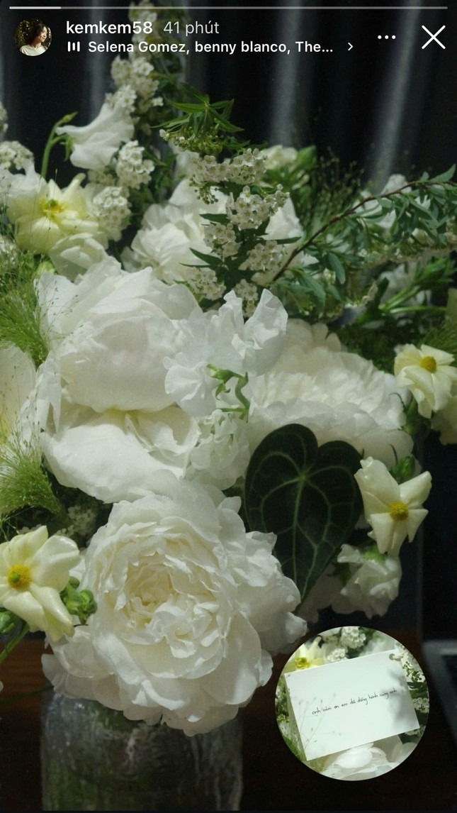 Chưa dừng tại đó, Kem còn đăng ảnh chụp một bó hoa màu trắng - xanh trên trang cá nhân. Dù không tiết lộ danh tính người tặng nhưng bức thư đi kèm xưng hô với Kem là "anh - em" khiến netizen nghĩ ngay đến HURRYKNG.