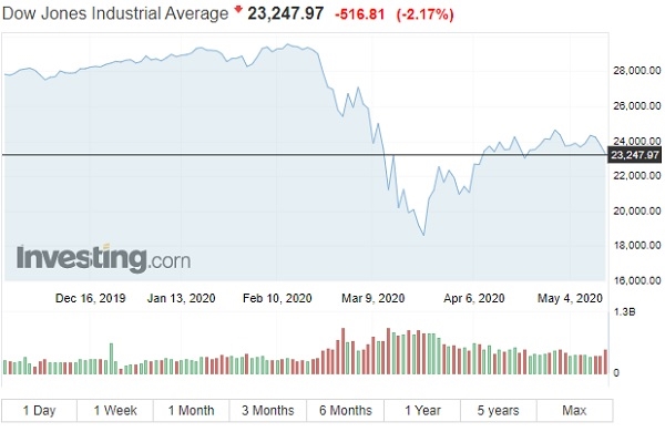 Chỉ số Down Jones giảm mạnh trong phiên 13.5. Ảnh: Investing.