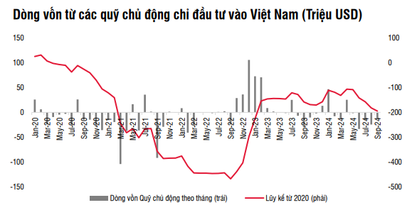 Trong khi đó, các quỹ chủ động vẫn duy trì trạng thái bán ròng trong tháng 9, với tốc độ hạ nhiệt hơn nhiều so với tháng 8. Đáng chú ý, dòng tiền từ các quỹ chủ động chỉ đầu tư vào Việt Nam đã bắt đầu quay trở lại trong tuần cuối tháng 9 với xu hướng mạnh mẽ từ nhóm quỹ Thái Lan. Tính tổng chung, các quỹ chủ động chỉ đầu tư vào Việt Nam đã rút ròng khoảng 320 tỷ đồng trong tháng 9 (thấp hơn so với mức 600 tỷ trong tháng 8).