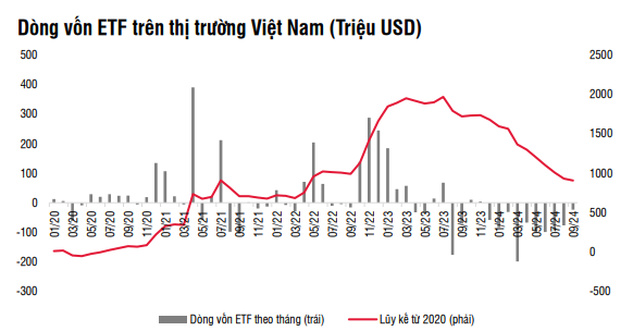 Tại thị trường Việt Nam, các quỹ ETF duy trì đà rút vốn liên tục từ đầu năm, tuy nhiên quy mô rút vốn tiếp tục thu hẹp. Giá trị rút vốn trong tháng 9 ghi nhận ở mức -713 tỷ đồng, là mức thấp nhất kể từ đầu năm. Tính từ đầu năm, các quỹ ETF đã rút ròng tổng cộng 20,93 nghìn tỷ, tương đương -27,6% tổng tài sản vào cuối năm 2023, đưa tổng tài sản các quỹ ETF về 60,8 nghìn tỷ đồng.