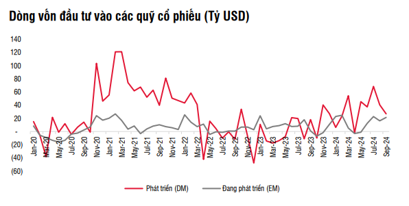 Dòng vốn vào cổ phiếu thị trường đang phát triển (EM) cũng tích cực nhờ đồng USD suy yếu và động thái nới lỏng từ Trung Quốc. Dòng vốn tăng mạnh lên 21,4 tỷ trong tháng 9. Phần lớn dòng tiền là từ các quỹ ETF phân bổ vào thị trường Trung Quốc (+15,5 tỷ USD), tập trung vào nửa cuối tháng và các quỹ chủ động cũng đã bắt đầu có tín hiệu giải ngân trong những ngày cuối tháng 9. Thị trường Ấn Độ vẫn ghi nhận vào ròng tháng thứ 18 liên tiếp và đáng chú ý, dòng tiền tiếp tục tín hiệu bắt đầu quay trở lại khu vực Đông Nam Á, với điểm sáng ở Indonesia (+51,5 triệu USD) và Malaysia (+24,5 triệu USD).