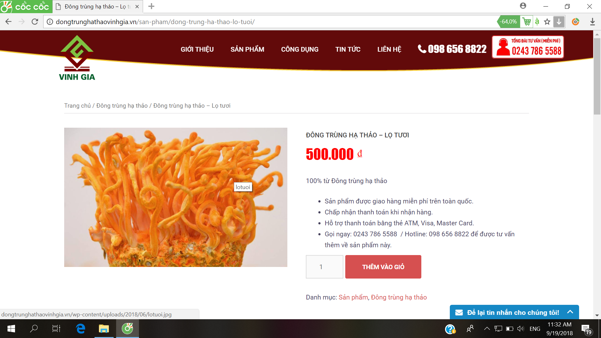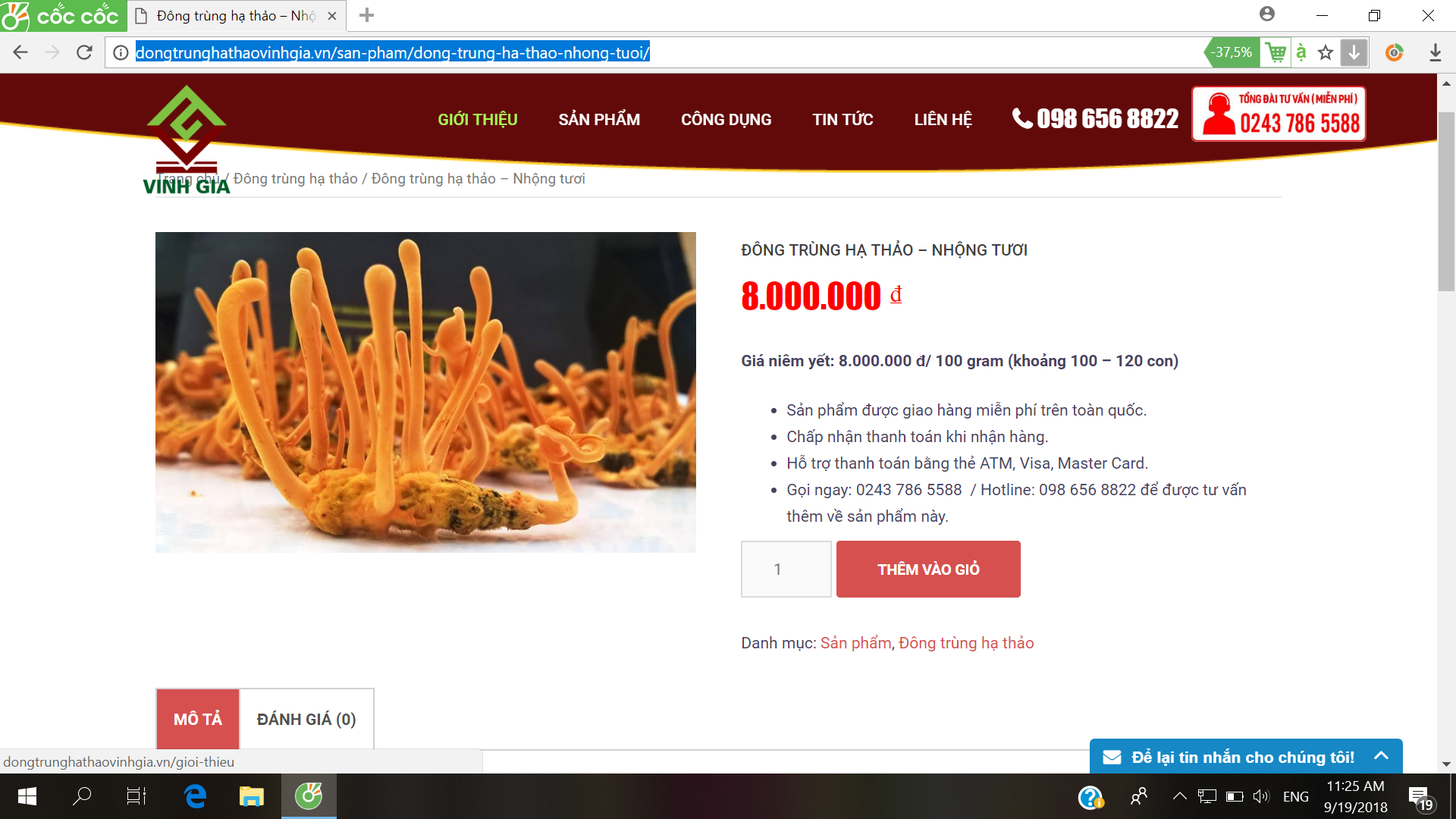 | Đông trùng Hạ thảo dạng tươi quảng cáo trên website của Cty Vinh Gia |