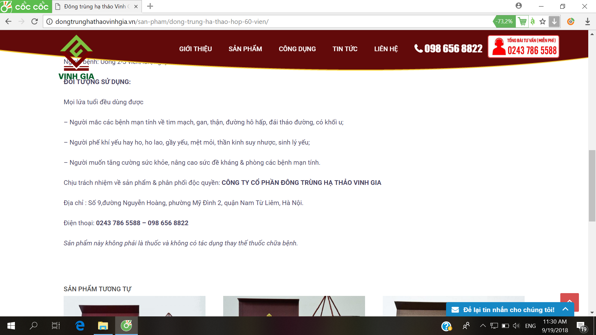 Sau khi tiếp nhận thông tin phản ánh, PV Thương Trường đã liên hệ và có buổi làm việc với Công ty Cổ phần Đông trùng hạ thảo Vinh Gia (Cty Vinh Gia) để xác nhận thông tin sản phẩm. Tuy nhiên, ngay sau đó phía công ty đã tháo gỡ thông tin mà không có lời giải thích.