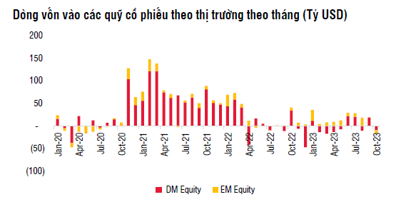 Cụ thể, dòng vốn vào quỹ cổ phiếu DM rút ròng 9,8 tỷ USD trong tháng 10. Sức hút từ thị trường Mỹ (+2,7 tỷ USD trong tháng 10) duy trì nhưng chưa đủ để cân bằng lực rút ròng ra khỏi thị trường Châu Âu. Tuy định giá thị trường Mỹ đang ở mức cao, rủi ro về địa chính trị và mức chênh lãi suất thực giúp dòng tiền vẫn tìm đến thị trường Mỹ nhằm tìm kiếm sự an toàn (flight to safety).