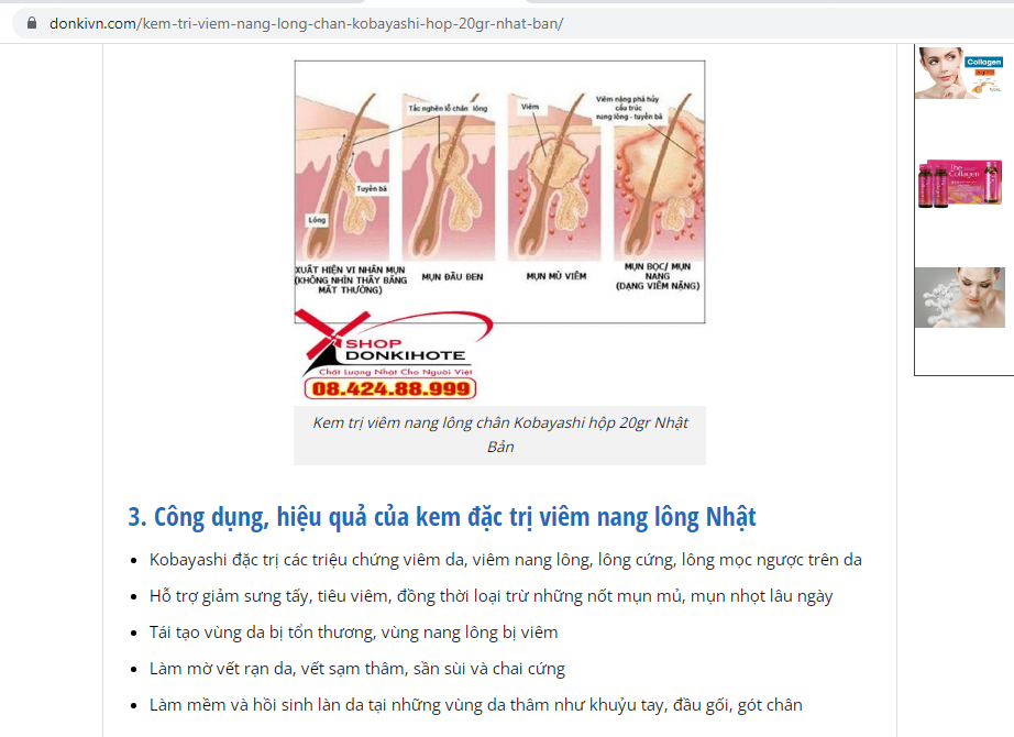 Theo quảng cáo của Donkihote Shop, công dụng, hiệu quả của kem đặc trị viêm nang lông Nhật Bản Kobayashi “đặc trị các triệu chứng viêm da, viêm nang lông, lông cứng, lông mọc ngược trên da; Tái tạo vùng da bị tổn thương, vùng nang lông bị viêm; Làm mờ vết rạn da, vết sạm thâm, sần sùi và chai cứng; Làm mềm và hồi sinh làn da tại những vùng da thâm như khuỷu tay, đầu gối, gót chân”.
