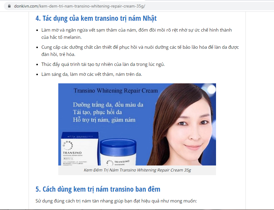 Cụ thể, với sản phẩm Transino Whitening Repair Cream loại 35g, cơ sở này ngang nhiên giới thiệu, rằng “Kem Đêm Trị Nám Transino Whitening Repair Cream 35g đặc trị mảng nám, tàn nhang, đồi mồi, trả lại cho bạn làn da trẻ hóa, căng tràn sức sống”.