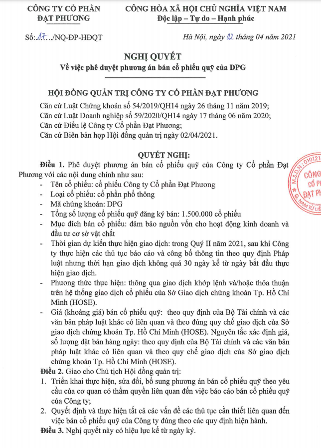 Sở GDCK TP HCM (HoSE) cho biết, HĐQT CTCP Đạt Phương (MCK: DPG) vừa thông qua phương án bán cổ phiếu quỹ.
