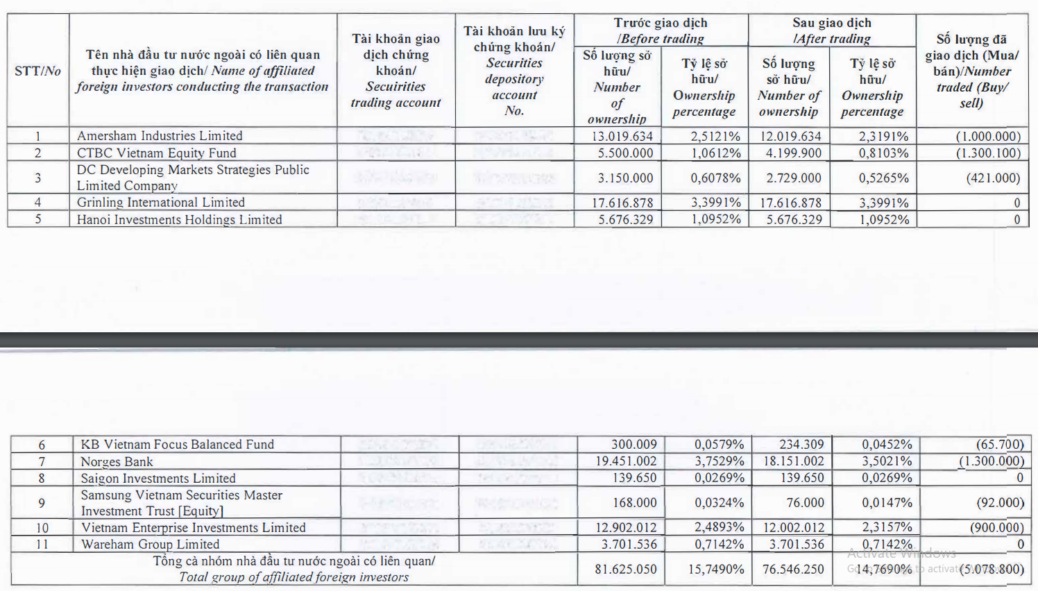 Các quỹ liên quan bán ra là CTBC Vietnam Equity Fund (1,3 triệu cổ phiếu), Norges Bank (1,3 triệu cổ phiếu), Amersham Industries (1 triệu cổ phiếu). Ngoài ra còn có VEIL, DC Developing Markets Strategies PLC, KB Vietnam Focus Balanced hay Samsung Vietnam Securities Equity cũng bán lượng lớn cổ phần.