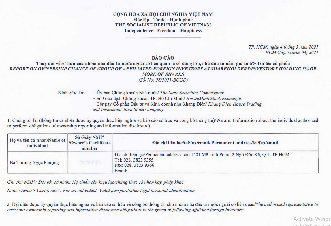 Cổ đông lớn Dragon Capital giảm sở hữu tại CTCP Đầu tư và Kinh doanh Nhà Khang Điền (MCK: KDH – sàn HOSE).