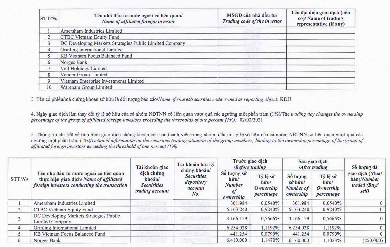 Trong đó, quỹ Vietnam Enterprise Investments Limited bán ra 130.000 cổ phiếu KDH và quỹ Norges Bank bán ra 250.000 cổ phiếu.