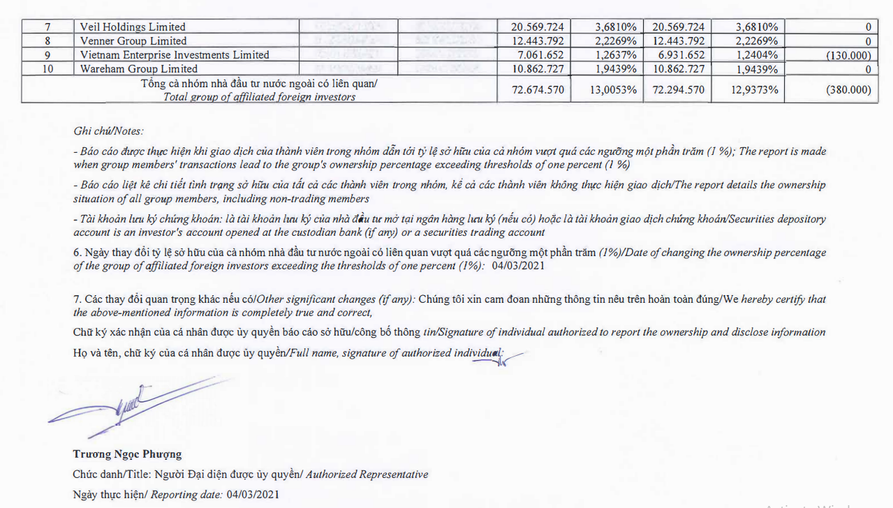 Theo đó, nhóm cổ đông liên quan tới Dragon Capital vừa bán ra 380.000 cổ phiếu KDH để giảm sở hữu từ 13% về 12,94% vốn điều lệ, giao dịch được thực hiện ngày 4/3.