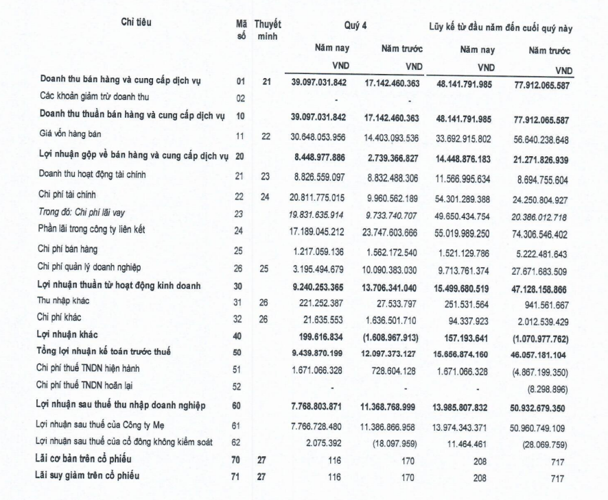 Tuy nhiên, chi phí tài chính tăng cao gấp đôi lên gần 21 tỷ đồng do tăng chi phí lãi vay, trong khi chi phí bán hàng và chi phí quản lý doanh nghiệp đều giảm so với cùng kỳ. Lãi từ công ty liên kết cũng giảm 29%, còn hơn 17,1 tỷ đồng.