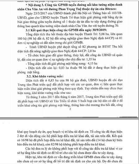 Trong tháng 12 năm nay, dự án đầu tư đường giao thông bao quanh khu tưởng niệm danh nhân Chu Văn An, UBND huyện Thanh Trì (Hà Nội) của Bitexco phải hoàn thành. Tuy nhiên với khó khăn vướng mắc liên quan đến khâu GPMB do 82/98 hộ không phối hợp điều tra kê khai, nhiều khả năng dự án BT 1.500 của Bitexco lại tiếp tục đối diện nguy cơ vỡ tiến độ.