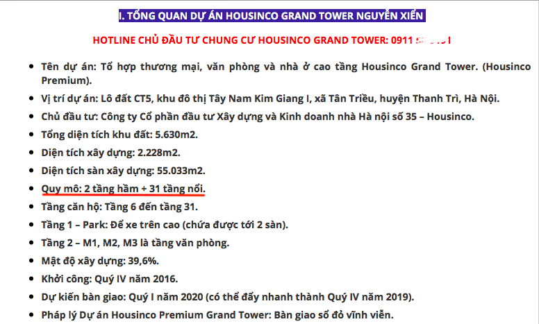 Dự án Tổ hợp văn phòng và nhà ở Housinco Tân Triều (Housinco Premium) do Công ty CP Đầu tư xây dựng và Kinh doanh nhà Hà Nội số 35 (nay là Công ty CP Tập đoàn Housinco) làm chủ đầu tư. Dự án nằm trên ô đất có ký hiệu CT5, tại Khu đô thị Tây Nam Kim Giang 1, xã Tân Triều, huyện Thanh Trì, TP Hà Nội. Theo giấy phép đối với dự án thời điểm hiện tại có chiều cao 27 tầng, bao gồm: 2 tầng sàn dịch vụ văn phòng; 25 tầng làm căn hộ; 1 tầng tum kỹ thuật thang máy.