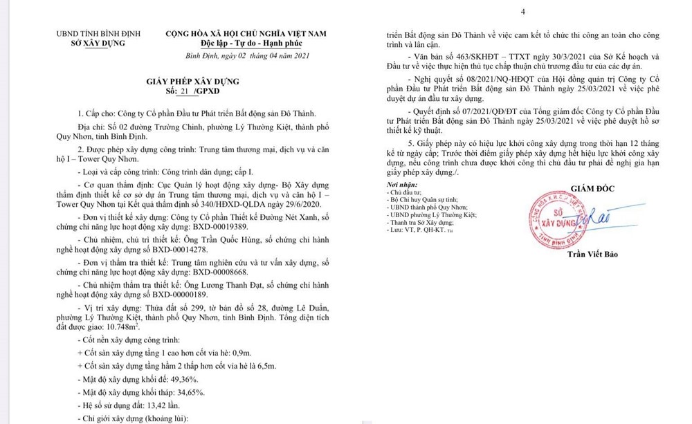 Ngày 02/04/2021, Sở Xây dựng tỉnh Bình Định đã chính thức cấp Giấy phép xây dựng số 21/GPXD cho dự án I – Tower Quy Nhơn. Văn bản được ban hành dựa trên kết quả thẩm định kỹ lưỡng phần thiết kế cho dự án theo Luật Xây dựng, Luật Đầu tư mới, …