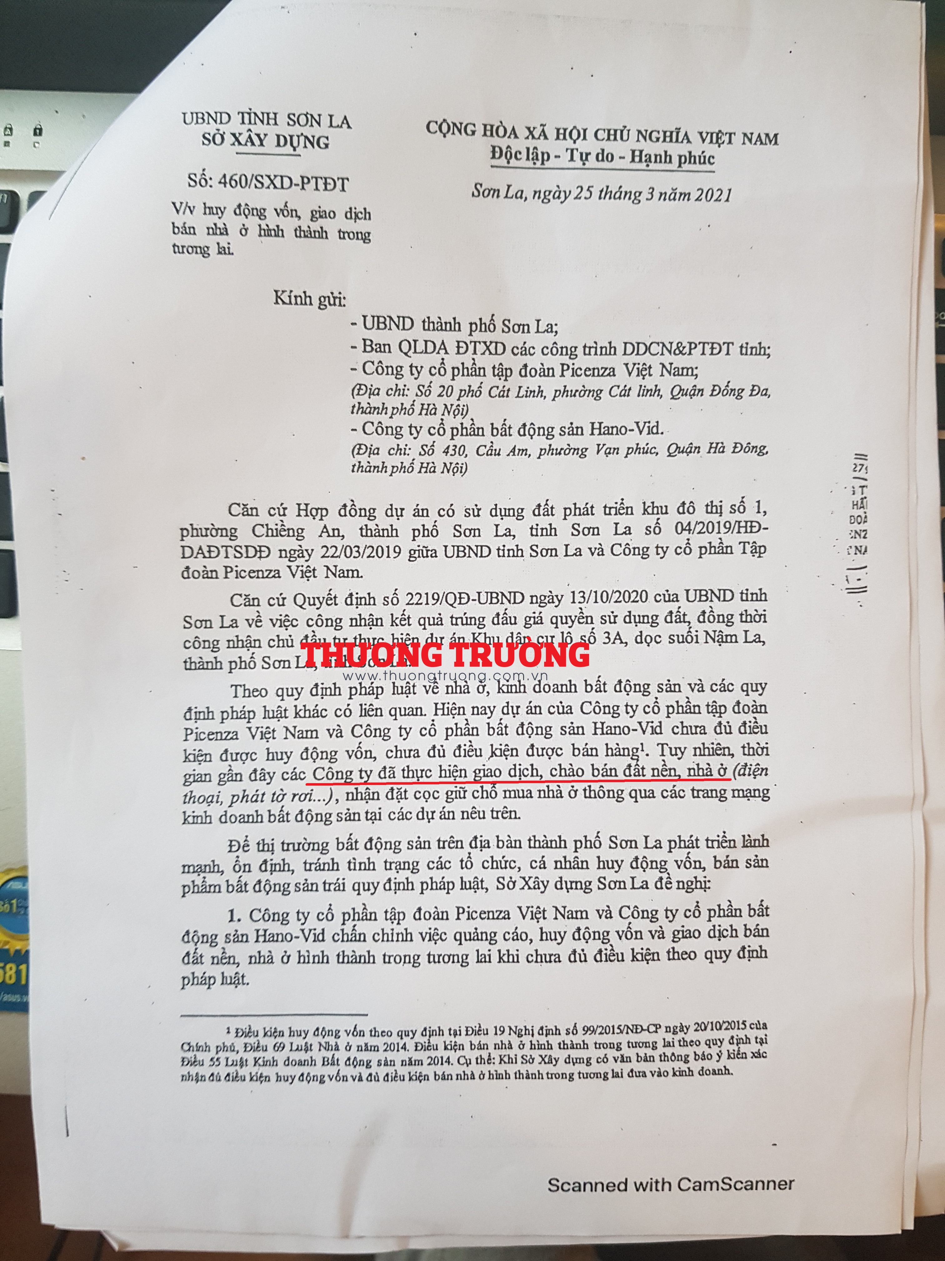 Ngày 25/03/2021, Sở Xây dựng Sơn La có văn bản số 460/SXD-PTĐT gửi đích danh Công ty cổ phần Tập đoàn Picenza Việt Nam về dự án Khu đô thị số 1, phường Chiềng An và dự án Khu dân cư lô số 3A, dọc suối Nậm La đều nằm trên địa bàn TP. Sơn La.