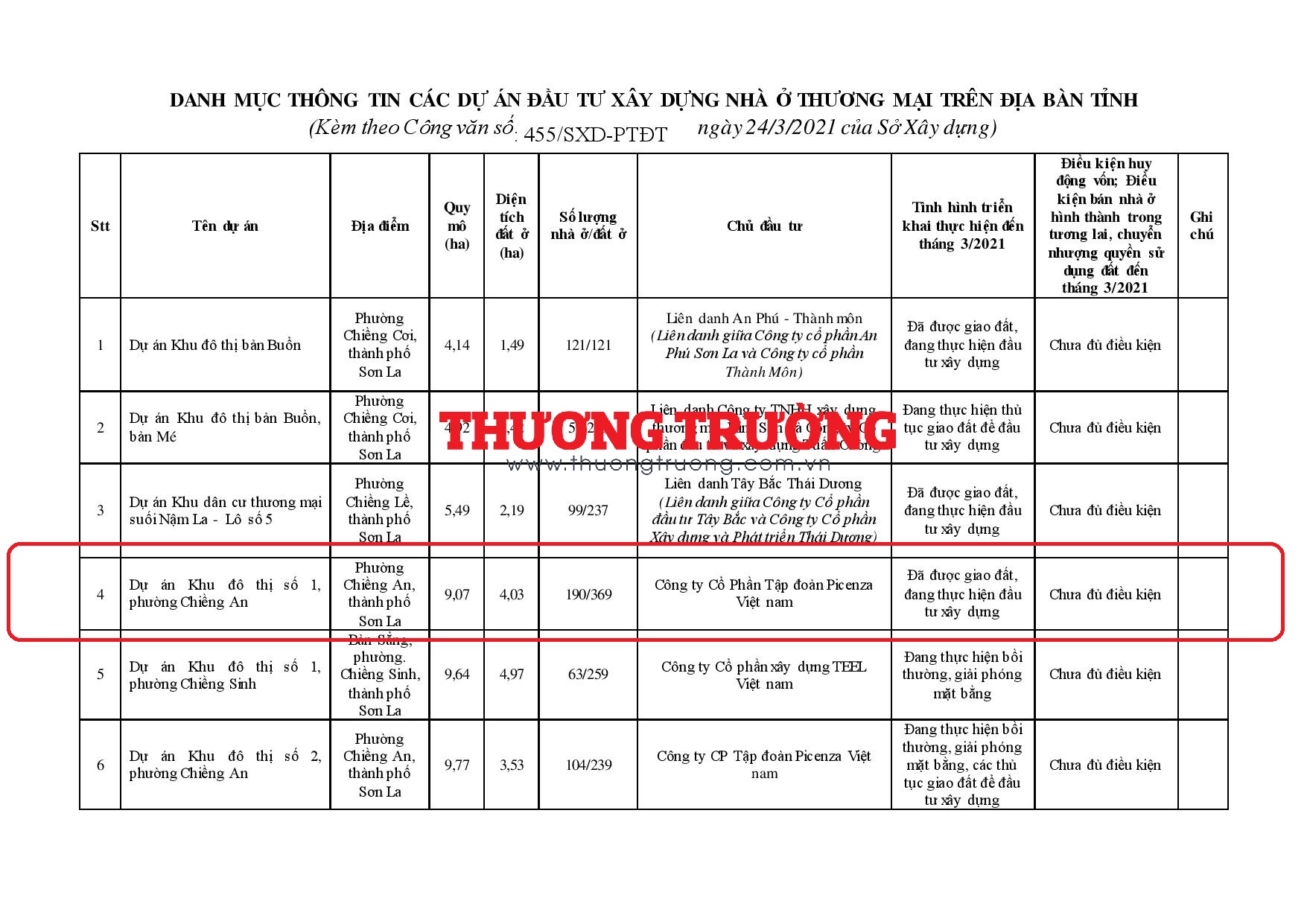 Trong đó, dự án Khu đô thị số 1, phường Chiềng An, TP. Sơn La do Công ty cổ phần Tập đoàn Picenza Việt Nam là chủ đầu tư hiện chưa đủ điều kiện để huy động vốn, chưa đủ điều kiện được bán hàng.