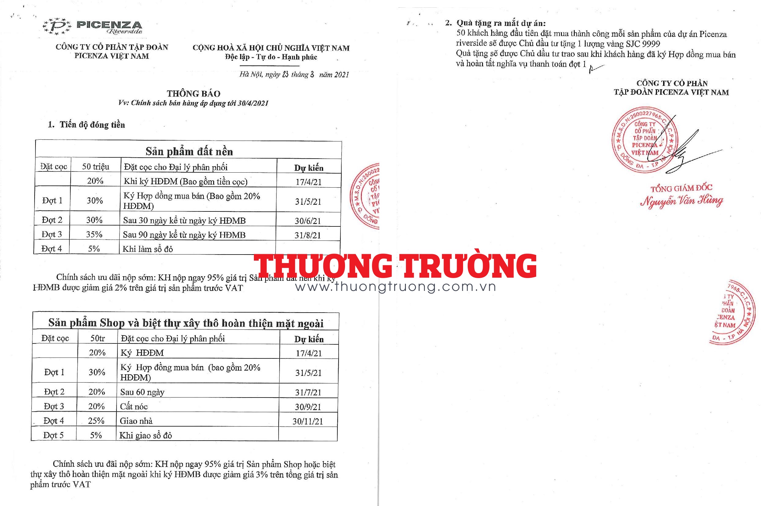Căn cứ vào Chính sách bán hàng áp dụng tới 30/4/2021 do ông Nguyễn Văn Hùng – Tổng Giám đốc Công ty cổ phần Tập đoàn Picenza Việt Nam ký và đóng dấu ngày 23/03/2021.