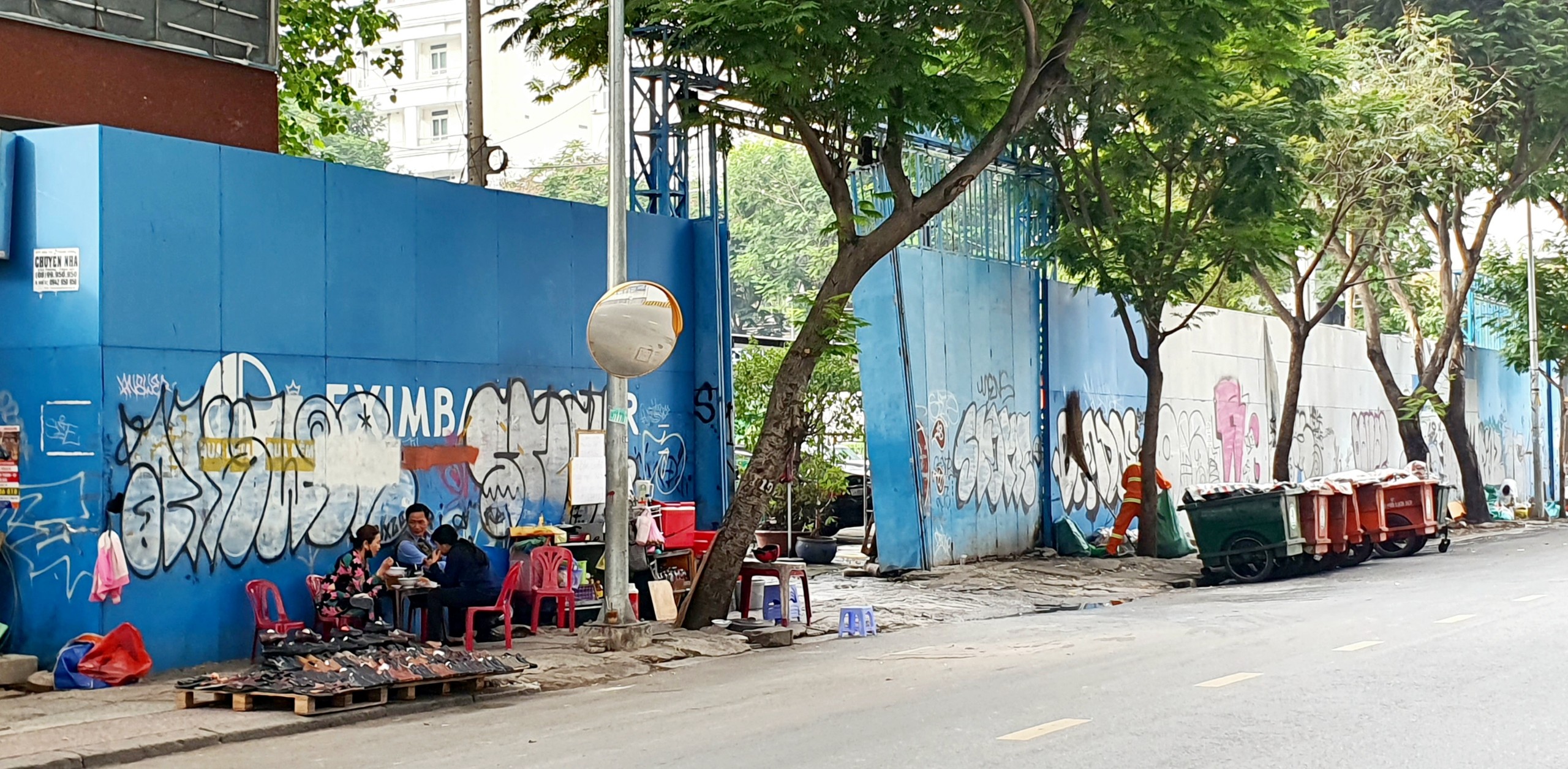 Bên ngoài dự án Trụ sở Eximbank tại số 7 Lê Thị Hồng Gấm, Quận 1, TP Hồ Chí Minh đang được "tận dụng" làm nơi tập kết thu gom rác thải và quán nước (Ảnh: Thiên An)
