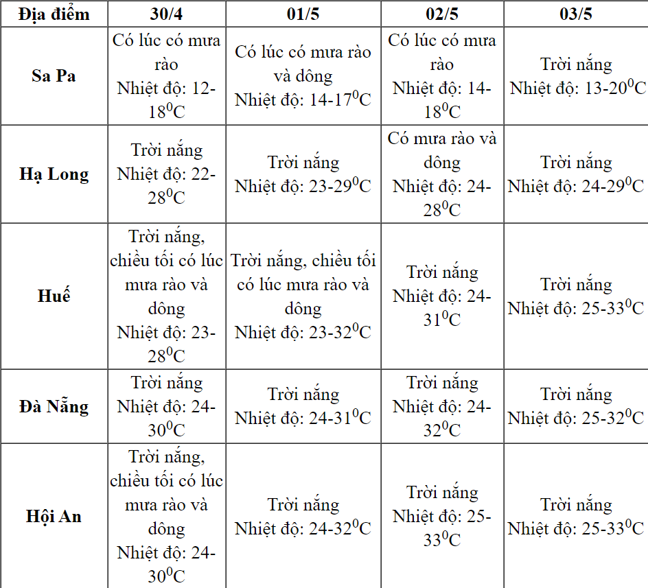 Từ ngày 30/4 đến ngày 03/5, ngày trời nắng, chiều tối và đêm có mưa dông cục bộ; riêng từ chiều tối ngày 01 đến ngày 02/5 có mưa rào và dông. Trong cơn dông có khả năng xảy ra lốc, sét và gió giật mạnh