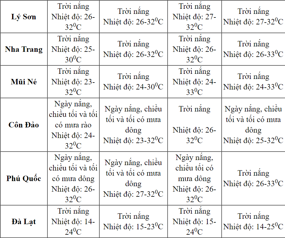 Dự báo thời tiết chi tiết tại một số địa điểm du lịch: