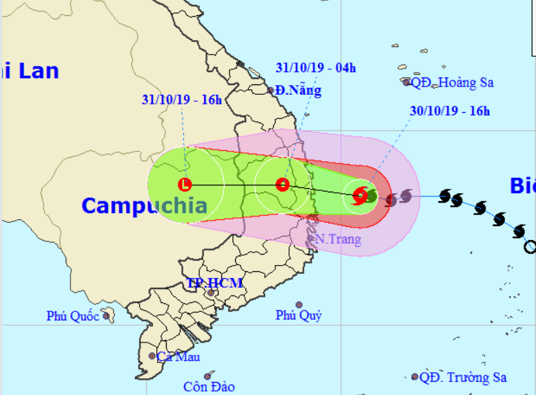 Dự báo trong 12 giờ tới, bão di chuyển theo hướng Tây, mỗi giờ đi được khoảng 15km, đi vào đất liền khu vực từ Quảng Ngãi đến phía Bắc Khánh Hòa sau đó suy yếu thành áp thấp nhiệt đới. Đến 04 giờ ngày 31/10, vị trí tâm áp thấp nhiệt đới ở khoảng 13,6 độ Vĩ Bắc; 108,5 độ Kinh Đông, trên khu vực Tây Nguyên. Sức gió mạnh nhất vùng gần tâm áp thấp nhiệt đới mạnh cấp 6-7 (40-60km/giờ), giật cấp 9.